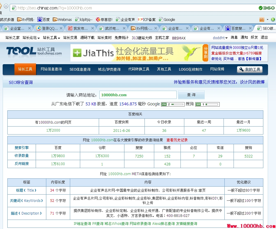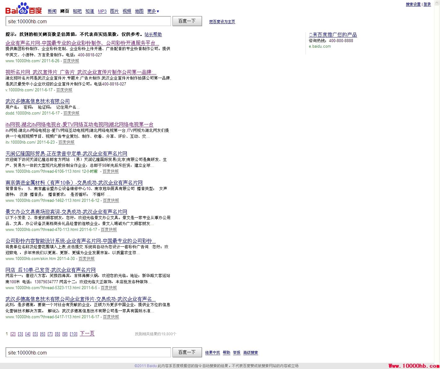 企业有声名片网10000hb.com一天被百度收录了一万九千六百条信息